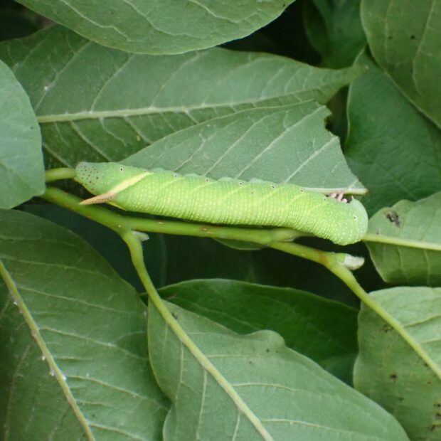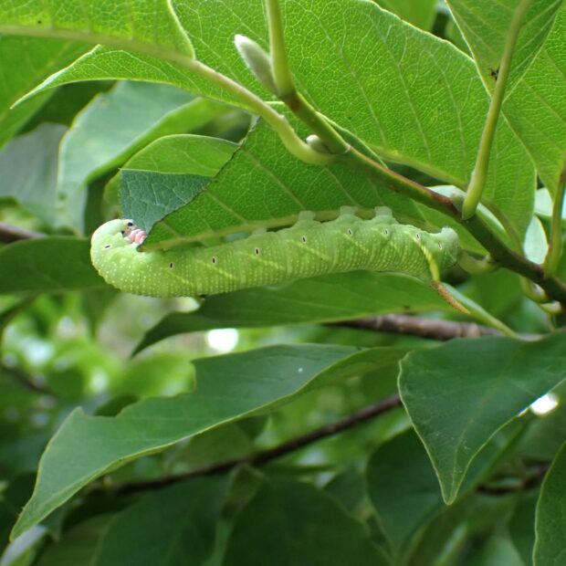 しもふり状のはねに、 黒い模様があるスズメガの仲間。 本州中部より西では、 山地で見られることが多いです。