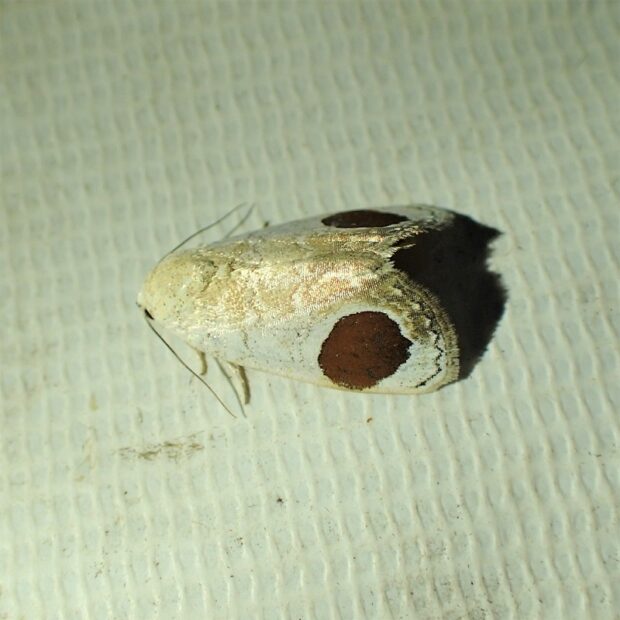 低山から山地で見られるヤガの仲間。 白いはねに、 赤茶色の大きな丸い紋が目立ちます。 幼虫はクルミやサワシバなどを食べて育ちます。 (MT)