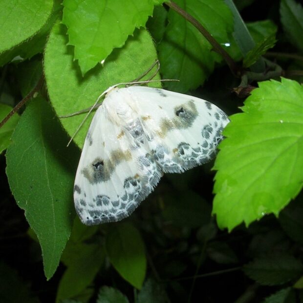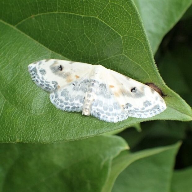 白っぽいはねに、 グレーや黒の模様があるヒメシャクの仲間。 はねにモヤモヤした模様があることから「雲紋(ウンモン)」と名づけられたようです。 市街地でも見られます。