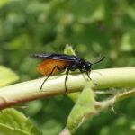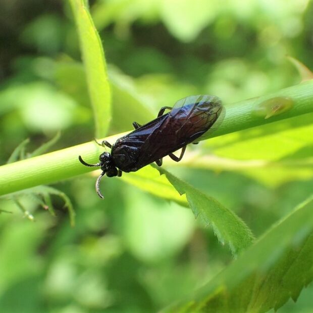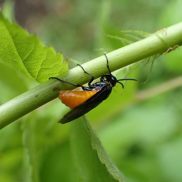 頭、 胸、 あしは黒色で、 腹部はオレンジ色のハバチ。 バラの若い枝に産卵し、 産卵のあとが広がり目立ちます。 幼虫は集団で葉を食べます。 ハバチは人を刺すことはありません。 (MT)