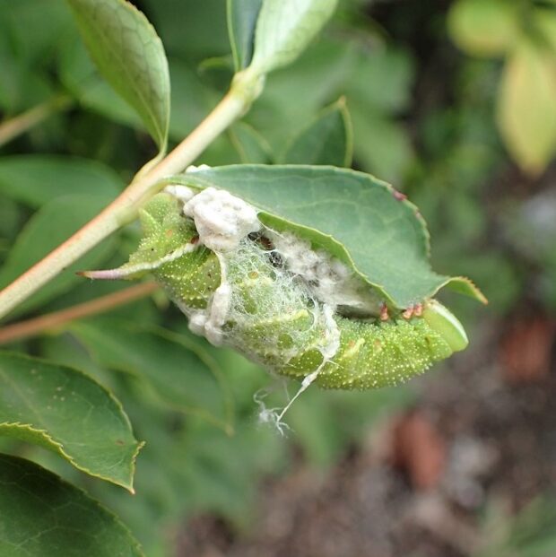 • ドウダンツツジの葉で菌類にとりつかれた幼虫。