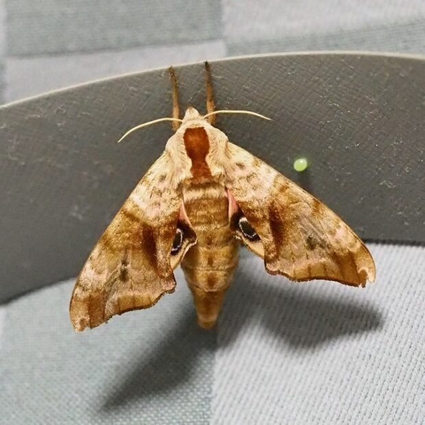 止まると三角形に見えるスズメガの仲間。 天敵が近づくと、 うっすらピンク色の後ばねを見せ、 目玉模様で脅かします。 植栽のドウダンツツジで見られることがあります。 (MT)