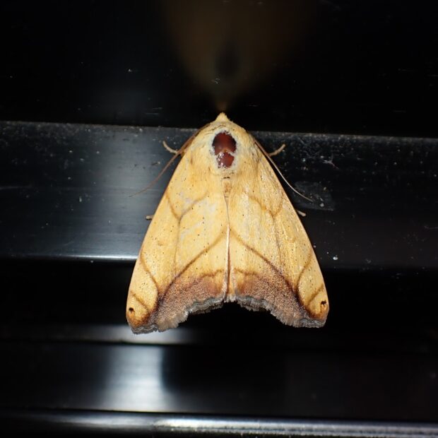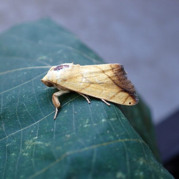 前ばねは淡い黄色で、 細い帯があるアオイガの仲間。 幼虫は、 背中の中央に走る黄色い帯と黒い紋が特徴的です。 フヨウでよく見かけますが、 畑のオクラにもやって来ます。 以前はフタトガリコヤガと呼ばれていました。