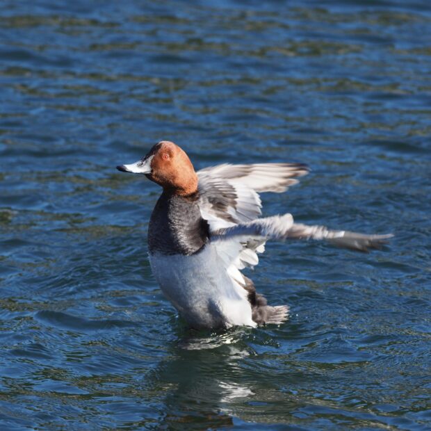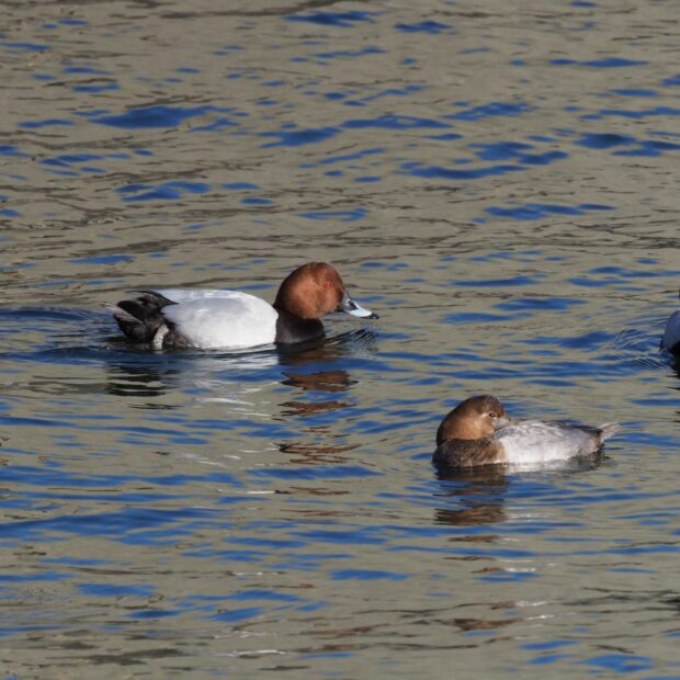 オスの頭と虹彩は赤色です。 くちばしは灰青色の線が入っています。 公園などでは餌付けされた個体がよく見られます。 水草の茎や根を食べるために、 潜水します。 採食は夕方に多く行い、 日中は岸の上や、 水上で休憩しています。