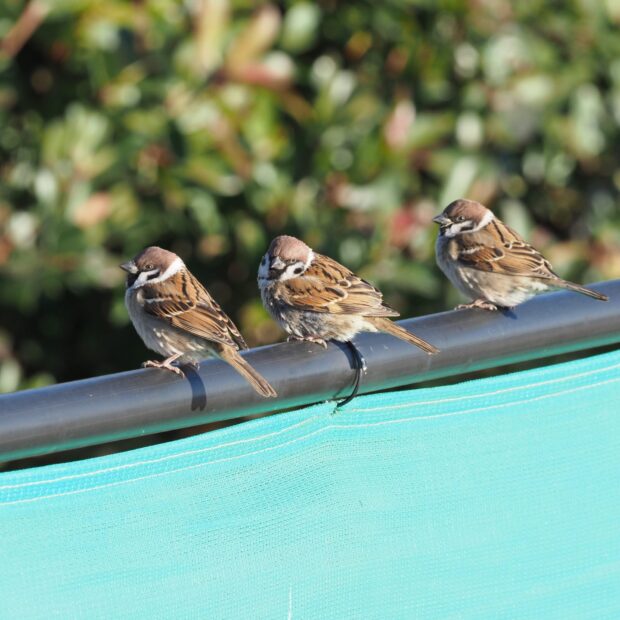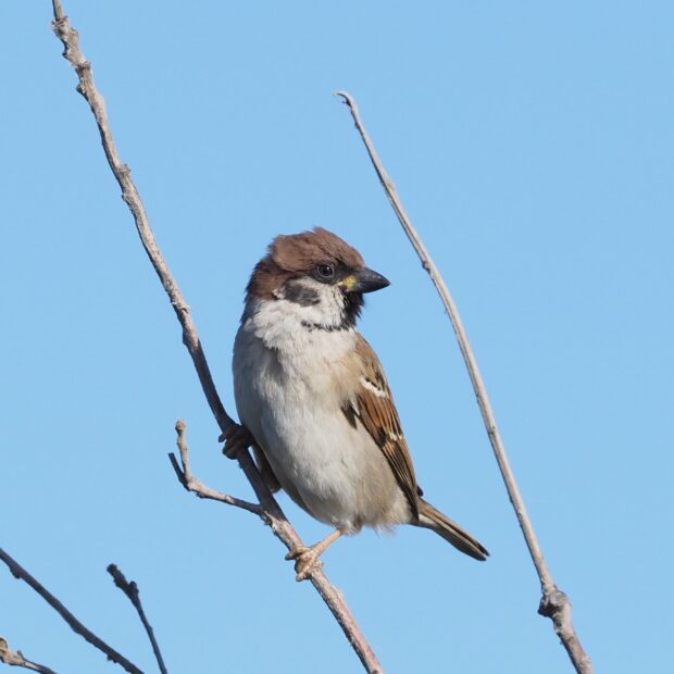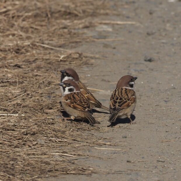繁殖期以外は群れで生活し、 樹上や地上で採食します。 地鳴きは、 「チュン、 チュン」と鳴きます。 顔は喉と目の周りが黒く、 頬に黒い斑点があります。 幼鳥はこの斑点の色が薄いです。 人工物に巣を作ることがあり、 信号機や道路標識などの穴や隙間に営巣します。
