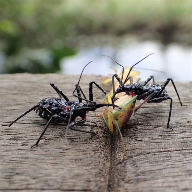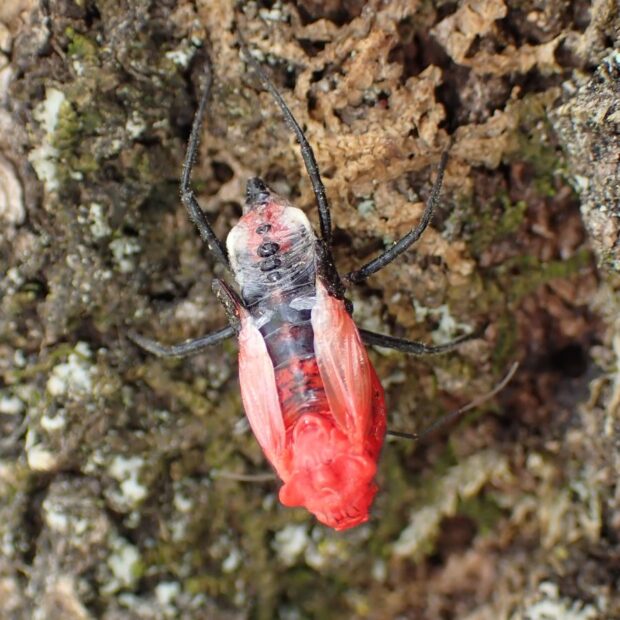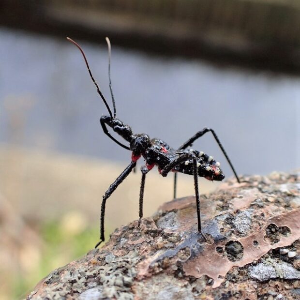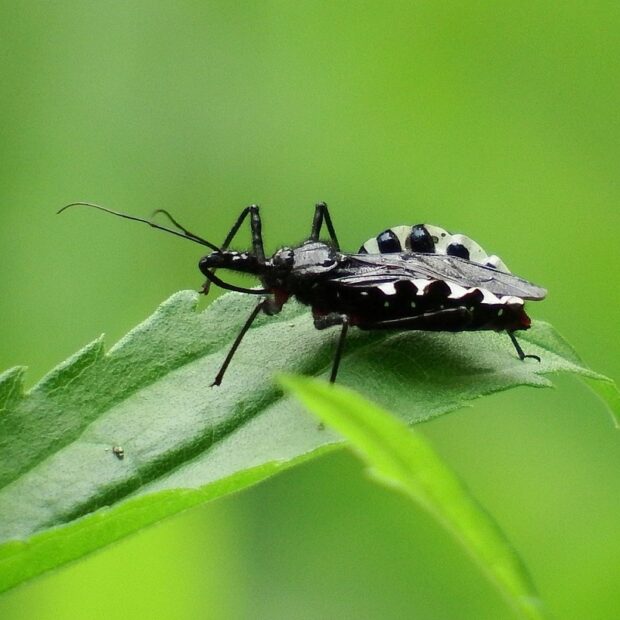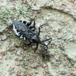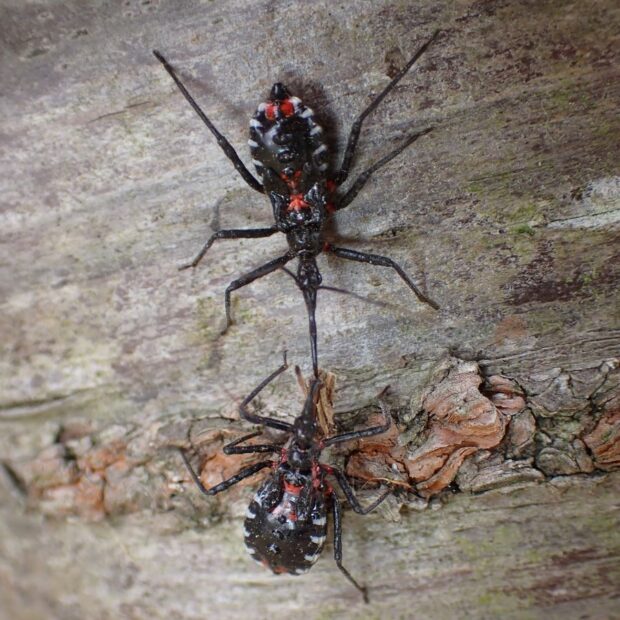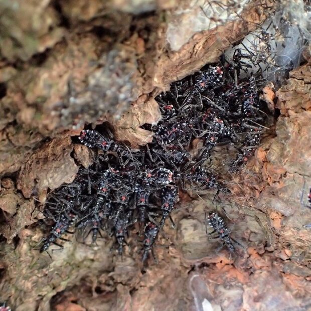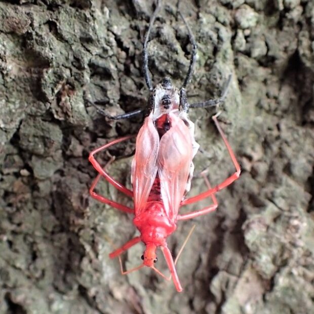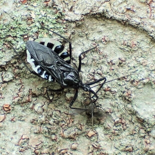 サシガメは肉食性のカメムシの仲間。 ヨコヅナサシガメは大型で、 広がった白黒のしま模様が横綱の化粧まわしに似ていることから、 ヨコヅナと名づけられました。 公園などの大きな木の幹のくぼみや洞で見られます。 大陸からの外来種と考えられています。