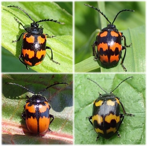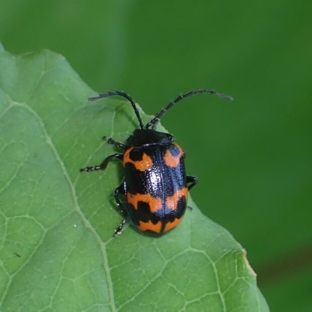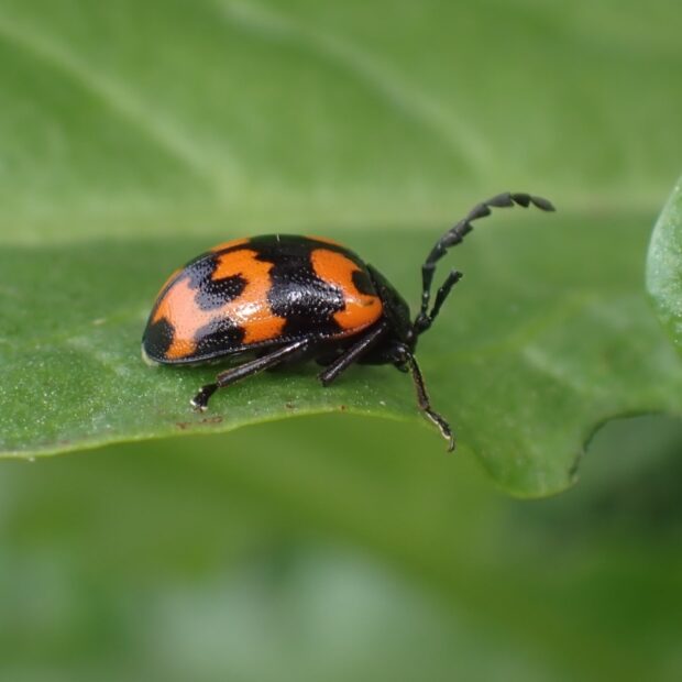 テントウムシ?いいえ、 立派な触角を持ったハムシです。 黒いはねに赤い紋が目立ちますが、 色や模様は変異がありさまざまです。 草地などで、 タデ科のイタドリ、 ギシギシ、 スイバなどの葉を食べます。 4月頃、 冬を越した成虫をよく見かけます。