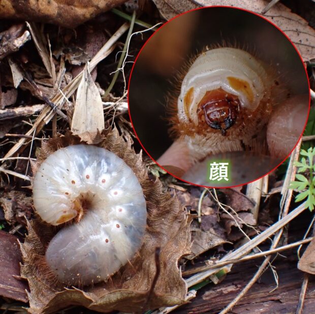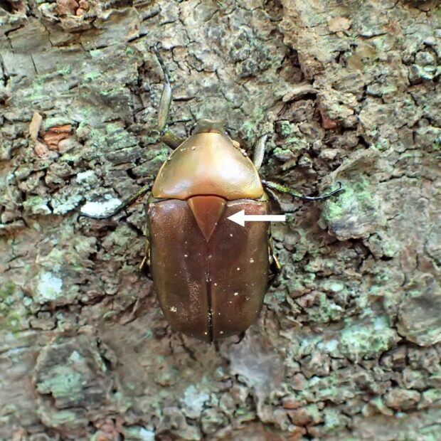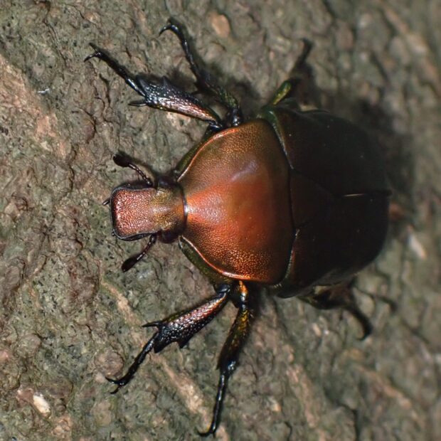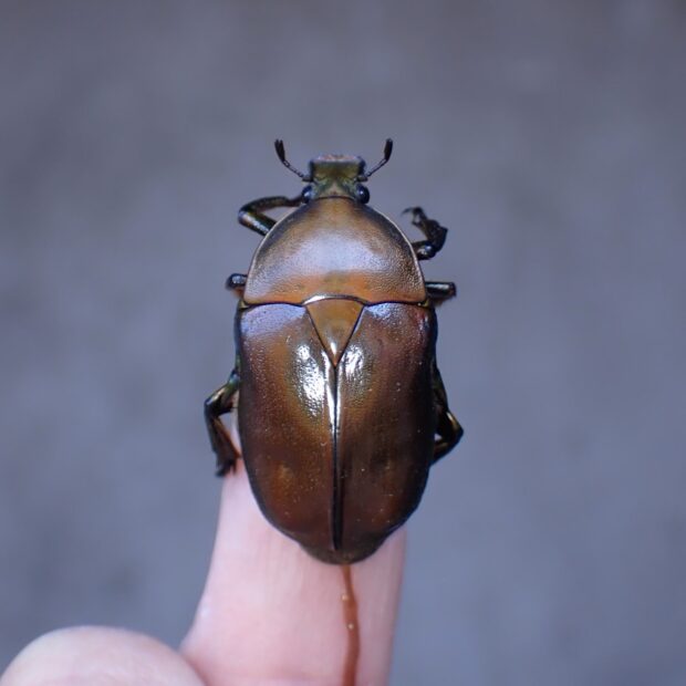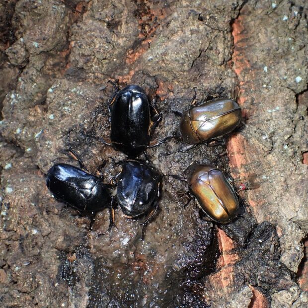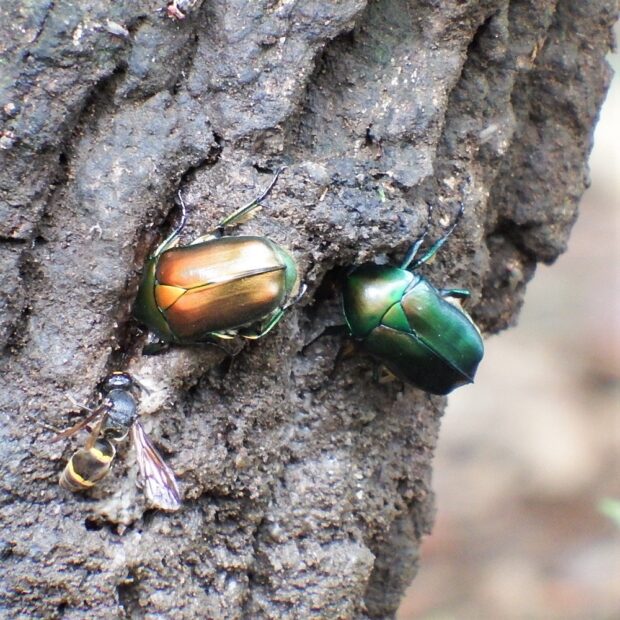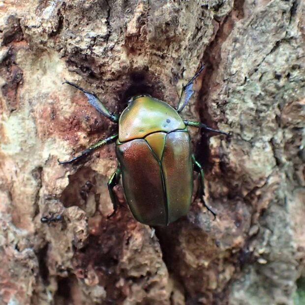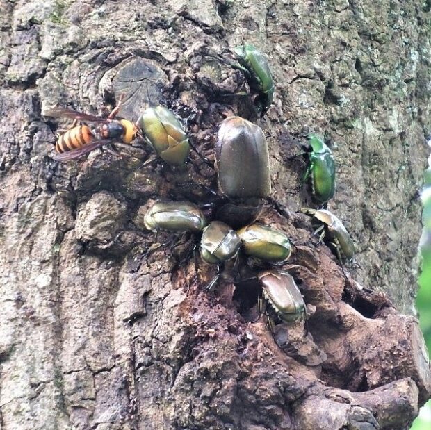 コガネムシの仲間。 雑木林や公園で、 クヌギなどの樹液に集まる普通種。 色は金属光沢のある赤銅色や緑色っぽいものなどさまざまです。 カナブンやハナムグリの仲間は、 上翅(じょうし)を広げずに、 後ばねだけを出して飛ぶことができます。