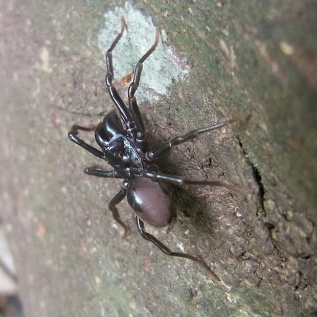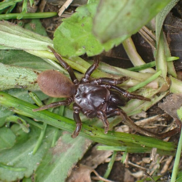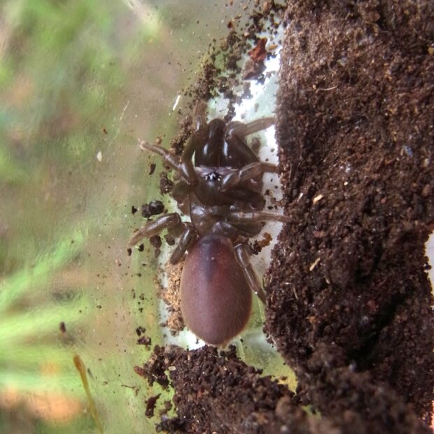ジグモの仲間。 地中にすむ原始的なクモで、 木の根元や塀などに袋状の住みかをつくります。 振動に敏感で、 獲物が近づくと、 クモはその位置まで上がってきて、 袋越しにかみつき、 袋を破って中に引き込みます。 成体になるまで3年以上かかります。