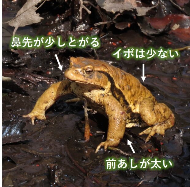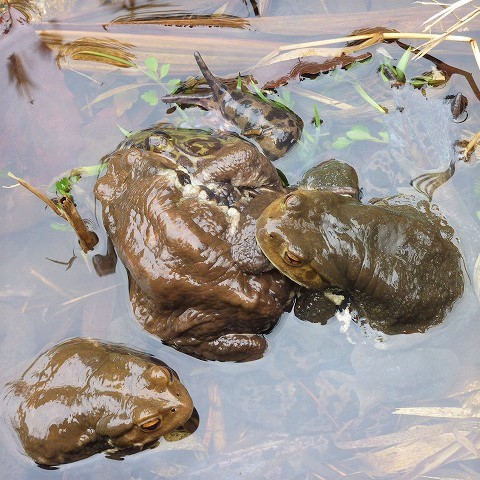 ニホンヒキガエルの1亜種で、 人家周辺や山地など広い範囲で見られるカエル。 繁殖は2~4月頃で、 たくさんのカエルが池や沼などに集まり、 「クックックッ・・・」とにぎやかにカエル合戦を繰り広げます。 オスはメスを見つけると背中に乗ります。