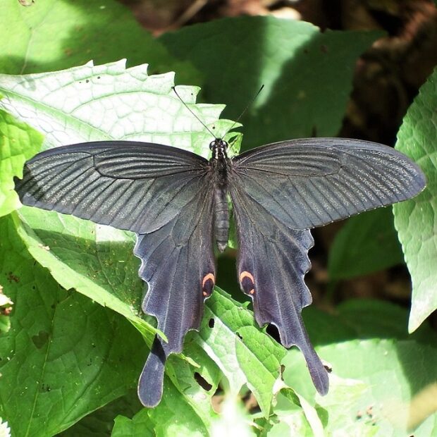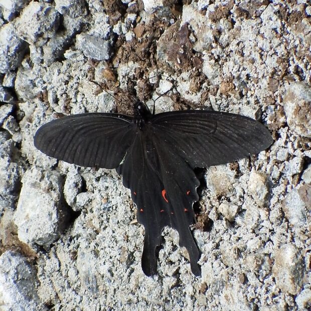 オナガアゲハは、 ほっそりしており尾状突起が長く、 腹部が黒いです。 山地、 渓流沿い、 雑木林の林縁で見られます。 オスは後ばね前縁に白い帯があります。