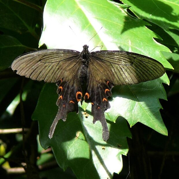 クロアゲハは、 尾状突起が短く、 街中でよく見られます。 オスは後ばね前縁に白い帯があります。