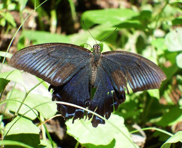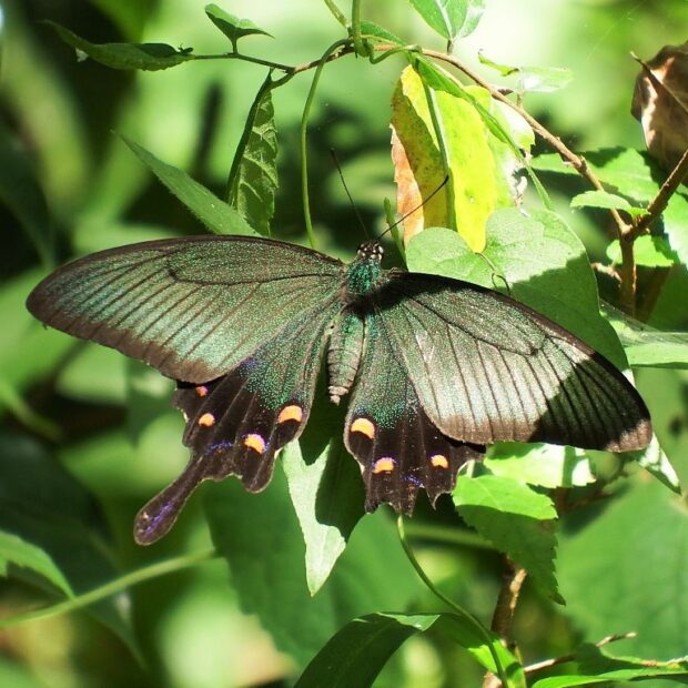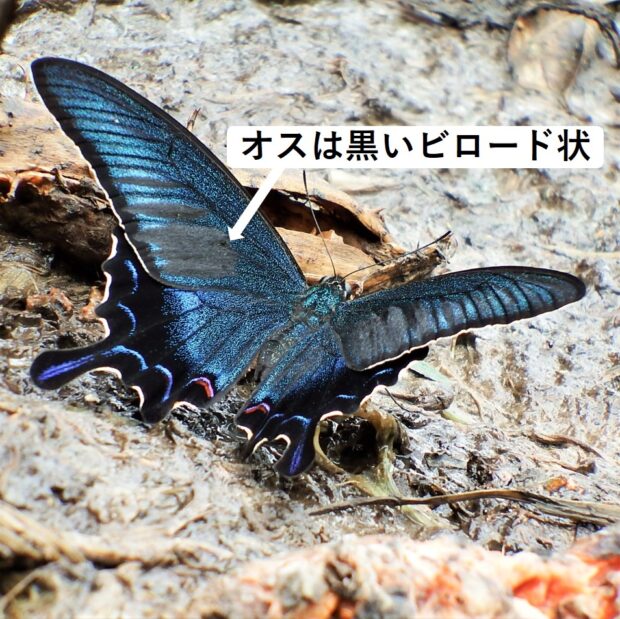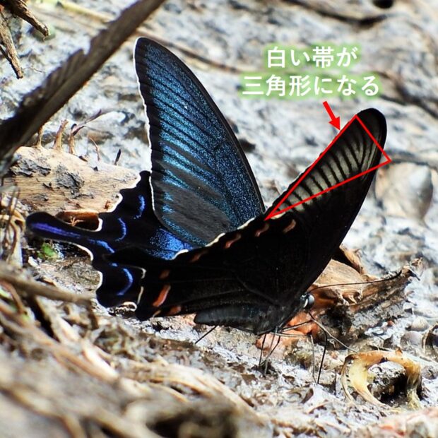 表ばねは緑色~青色に輝き、 光があたる角度によって色が変化します。 前ばねの裏面は逆三角形の白い帯があります。 幼虫は、 栽培ミカン類よりも、 コクサギ、 カラスザンショウなど野生の植物を好むようです。