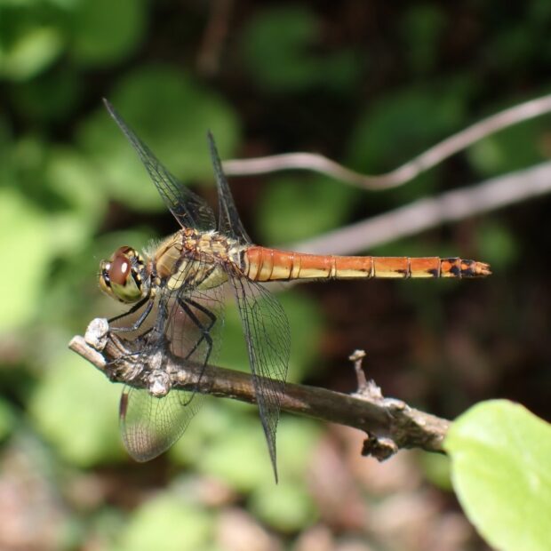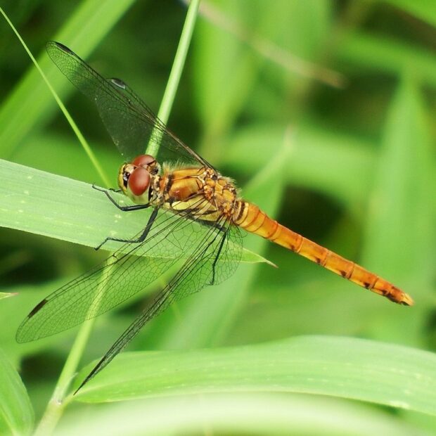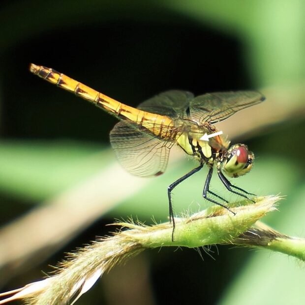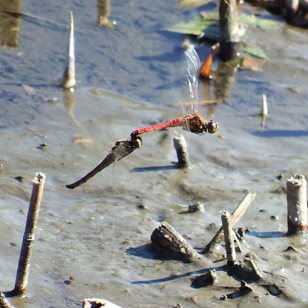 アキアカネは6月頃に羽化すると、 高い山に移動して過ごします。 秋になると平地に下りてきて、 メスは田んぼや湿地に産卵します。 卵で越冬し春に幼虫((ヤゴ)になります。 古くから日本人が親しみ、 たくさん見られたトンボですが、 減少してきています。