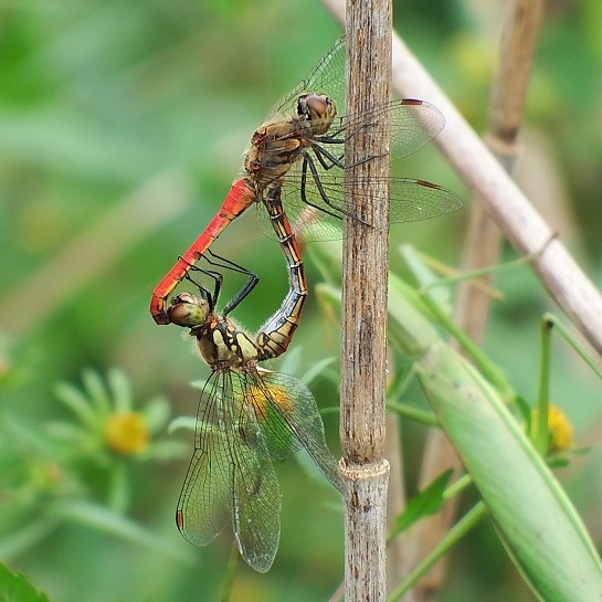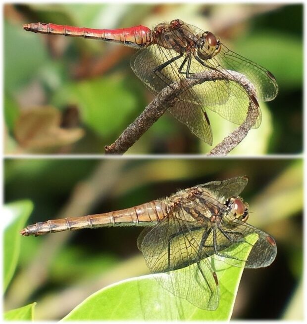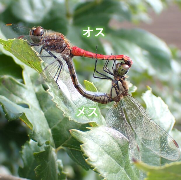 ナツアカネと似ていますが、 アキアカネの方がやや大きいです。 成熟すると、 アキアカネ(オス)は腹部だけが赤くなりますが、 ナツアカネ(オス)は全身がまっ赤になります。 胸の模様も違います。