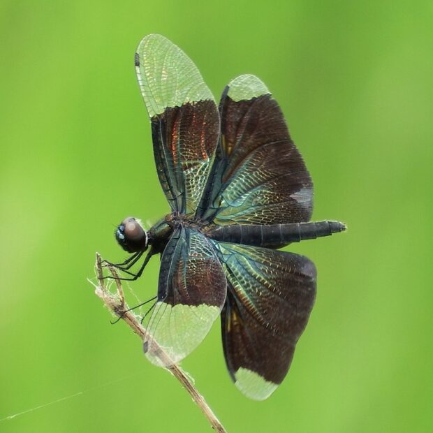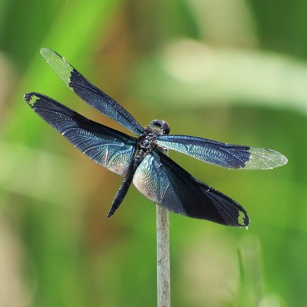 水生植物が多い池で見られるトンボ科の仲間。 幅が広い金属光沢のはねを持ち、 チョウのようにヒラヒラ飛びます。 オスのはねは青紫、 メスは緑色の光沢があり、 光の当たり方で色が変わります。 まれにオスと同じ青紫色のはねをもつメスも見られます。