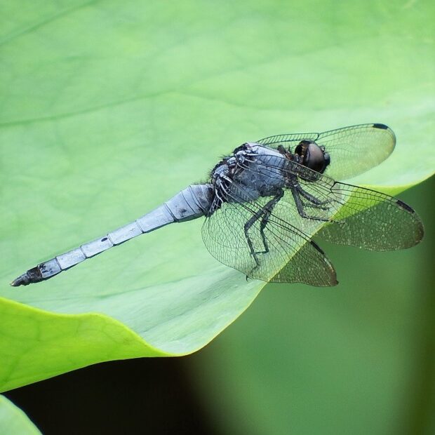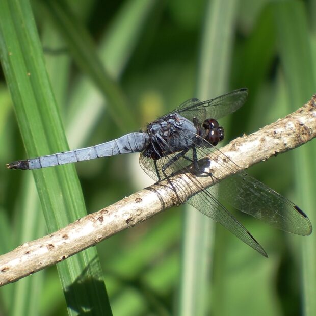 シオカラトンボのオスは青白く、 眼の色は青緑色です。
