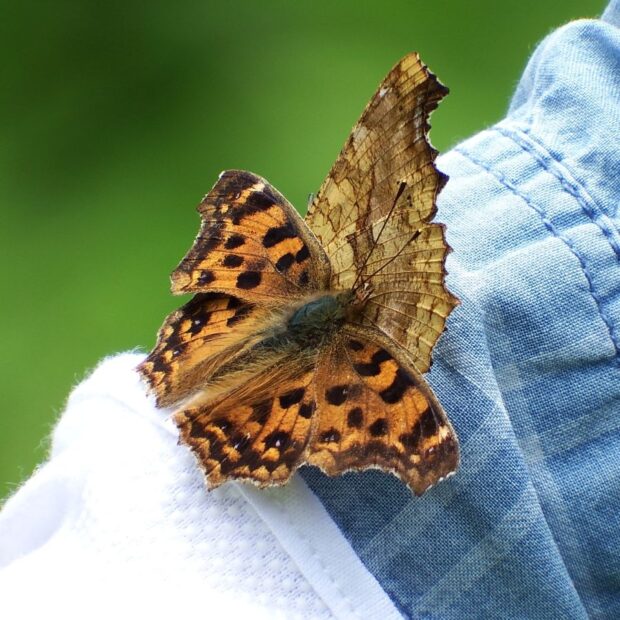 キタテハは、 平地~低山地のカナムグラが生える草地で見られます。 北海道では少ないです。