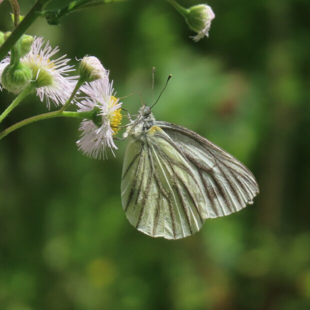 モンシロチョウと似ていますが、 はねに黒いすじがあり、 ややうす暗い環境を好みます。 人家周辺で普通に見られます。 オスをつかまえてかいでみると、 レモンのような匂いがします。