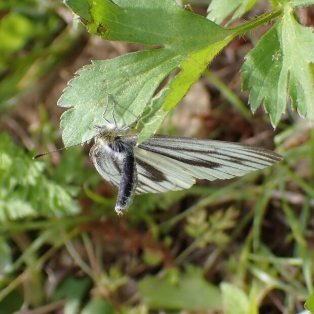 スジグロシロチョウは、 やや薄暗い環境を好み、 はねの翅脈(しみゃく=すじのこと)が黒いです。