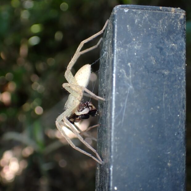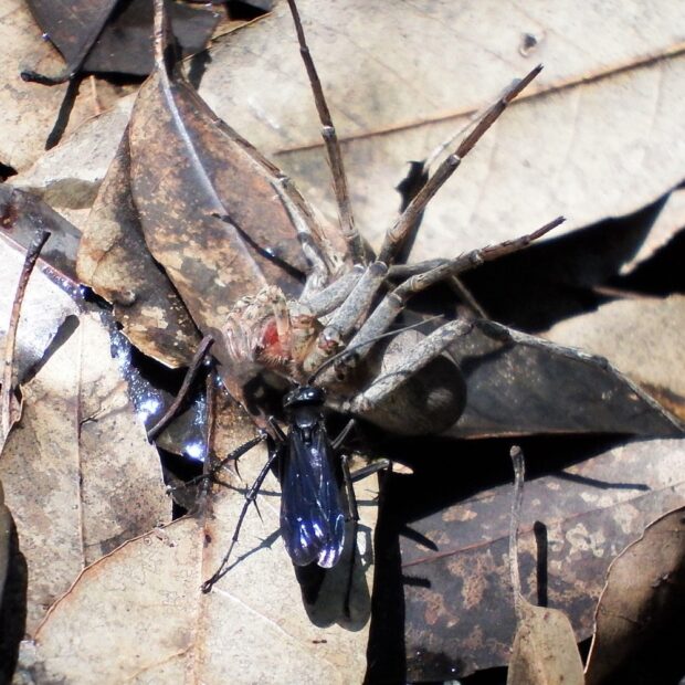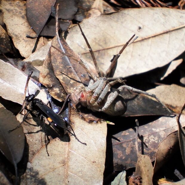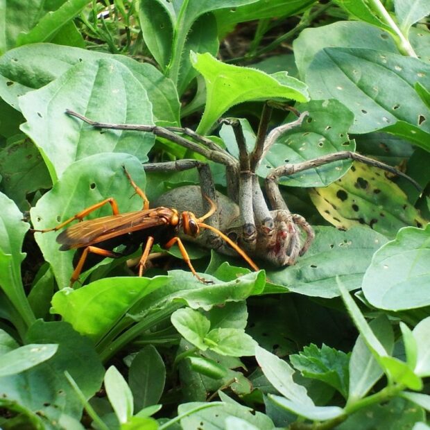 鳥やスズメバチなどの他、 カリバチの仲間のクモバチに襲われることがあります。 クモバチは、 クモを狩り、 子どものエサにします。 クモバチの種類によりどんなクモを狩るのか、 おおよそ決まっています。
