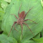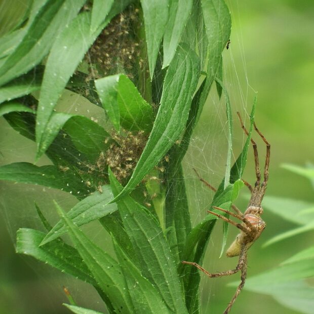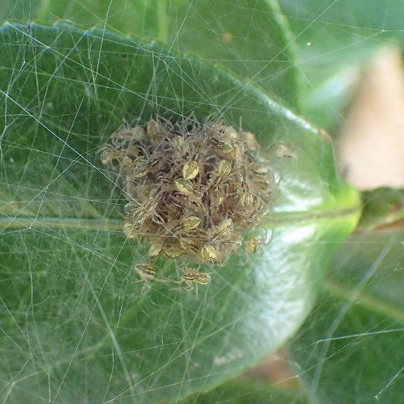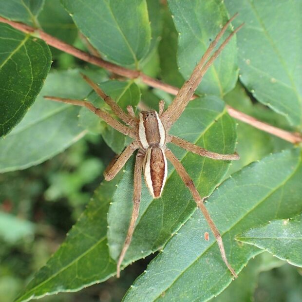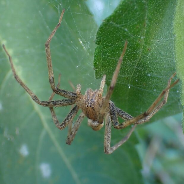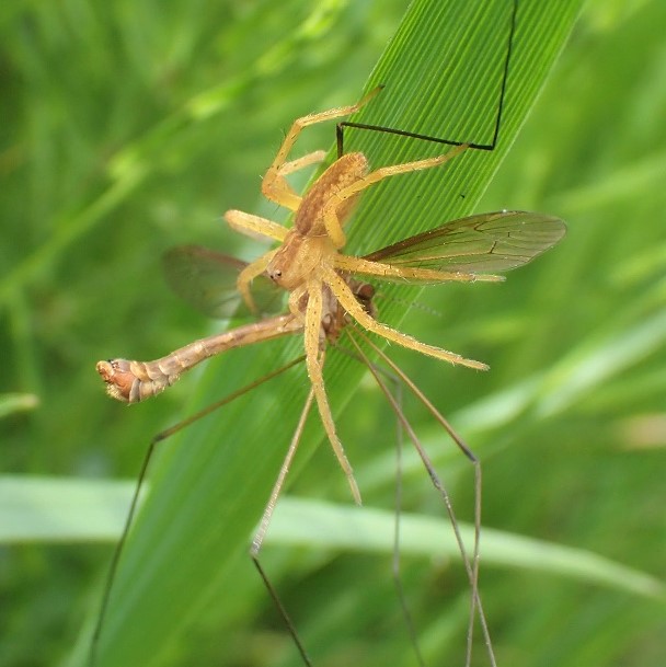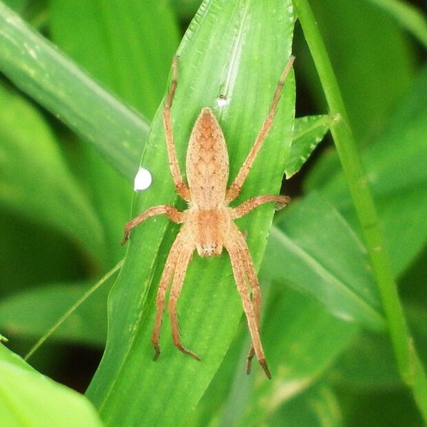 あしの長い大きなクモ。 黄色や褐色のもの、 白い帯があるもの、 まだら模様があるものなど、 色や模様はさまざまです。 水田の周辺、 草地などの草や木で見られます。 網を張らずに、 待ち伏せをして獲物をとらえます。