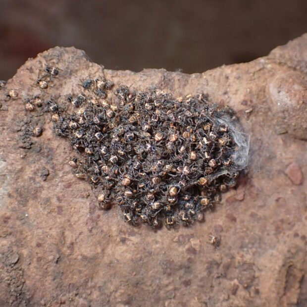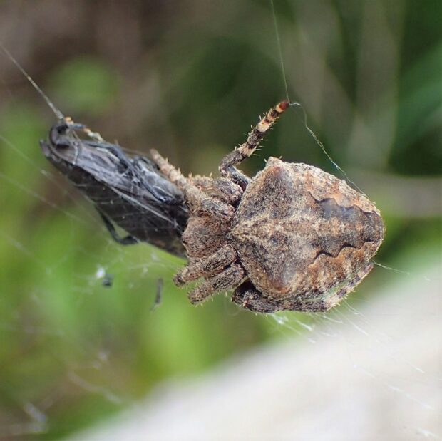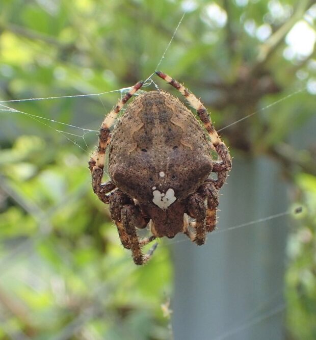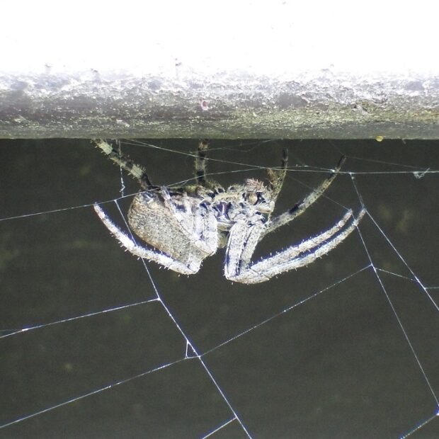 大きな円網をはるコガネグモの仲間。 家の周りで見られる茶色っぽい大きなクモ。 日中は物陰に隠れており、 夕方になると網をはり活動を始めますが、 昼間でも網を張っていることがあります。