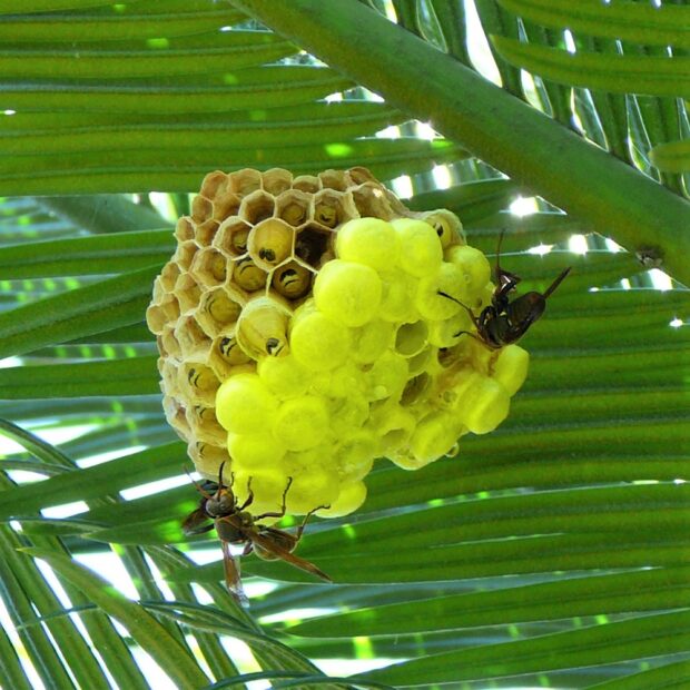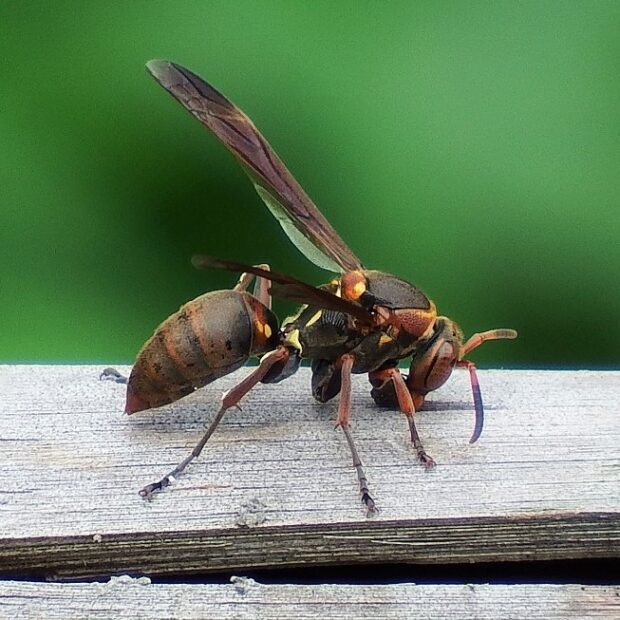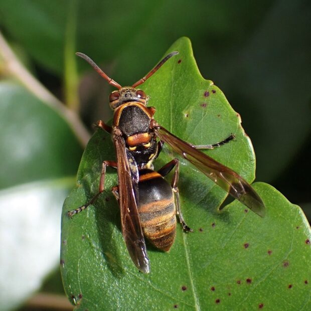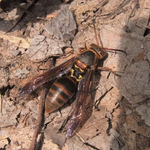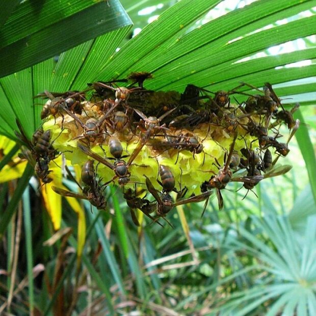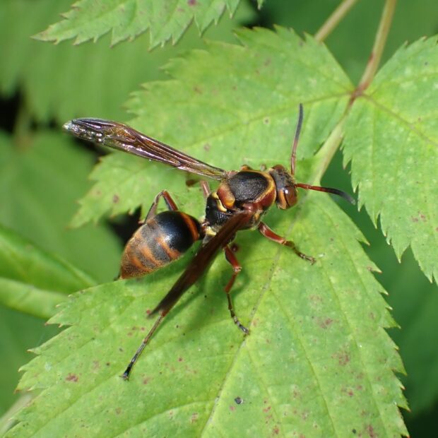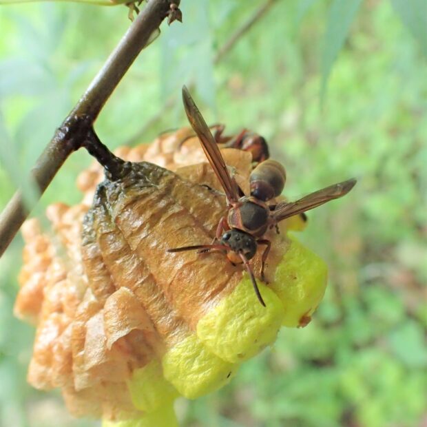 全体的に茶色っぽいアシナガバチ。 女王バチは、 樹木の枝や葉の裏に、 4月頃から巣を作り始め、 6月頃に働きバチがあらわれます。 だんだん巣が大きくなり、 夏の終わり頃、 新女王バチとオスバチがあらわれます。