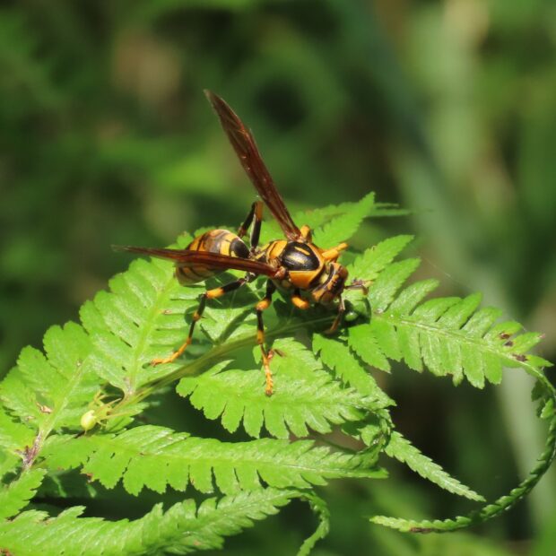 黄色っぽい大型のアシナガバチ。 女王バチは、 樹木の枝や葉の裏に、 4月頃から巣を作り始め、 6月頃に働きバチがあらわれます。 だんだん巣が大きくなり、 夏の終わり頃、 新女王バチとオスバチがあらわれます。