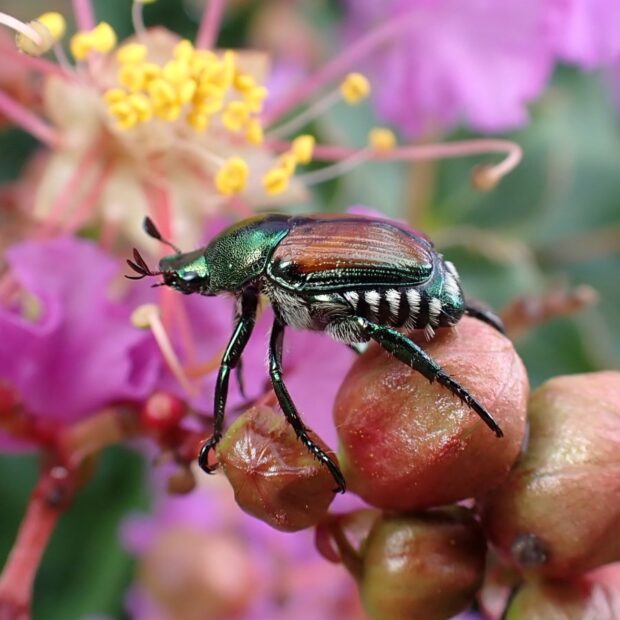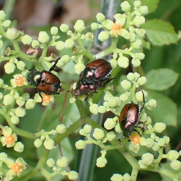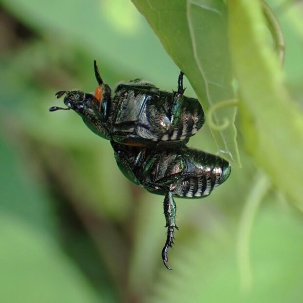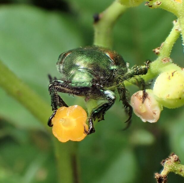 胸が緑色で、 上翅(じょうし)が茶色~緑色の小さなコガネムシ。 街中の公園、 人家周辺、 畑などで普通に見られ、 マメ科の植物などいろいろな葉や花を食べます。 アメリカにも侵入し、 「ジャパニーズ・ビートル」と呼ばれています。