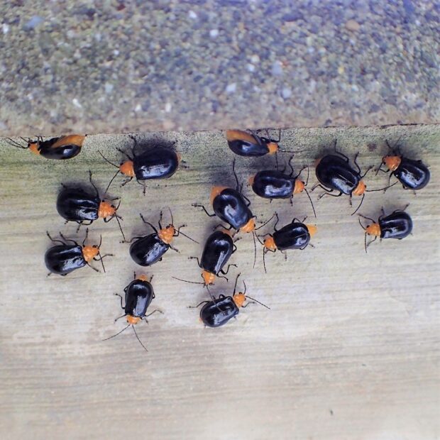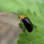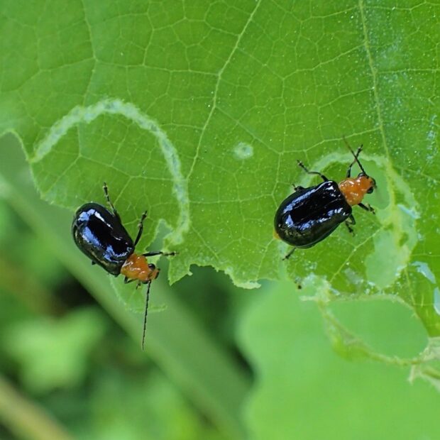 頭と前胸がオレンジ色で、 上翅とあしが黒いヒゲナガハムシの仲間。 公園、 草はら、 畑などで、 普通に見られます。 カラスウリ類の葉を好み、 葉を丸く傷をつけてから、 中の葉を食べます。 この食べ方は植物が出す苦みや粘りを遮断すると言われています。
