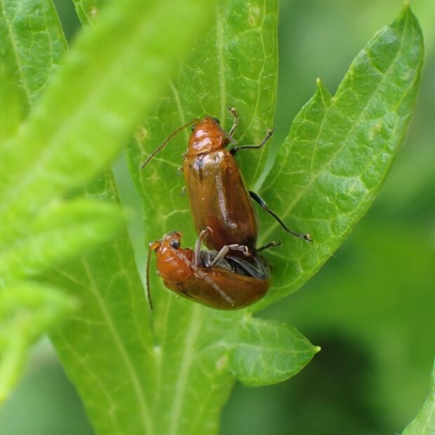 草地や公園などで普通に見られるオレンジ色のハムシ。 畑のキュウリやスイカなどウリ科植物の葉を食べますが、 ウリ科以外の野菜も食べることがあります。 幼虫は土の中で根を食べて育ち、 土の中で蛹になります。