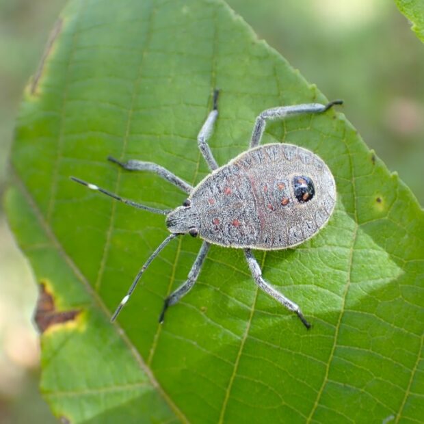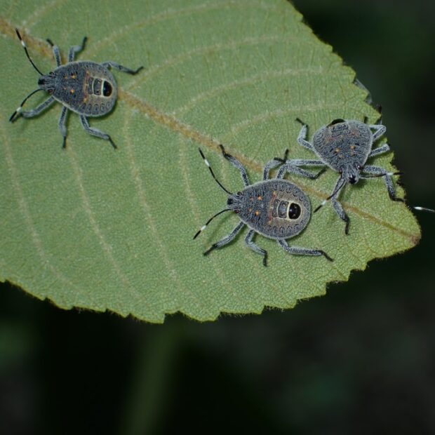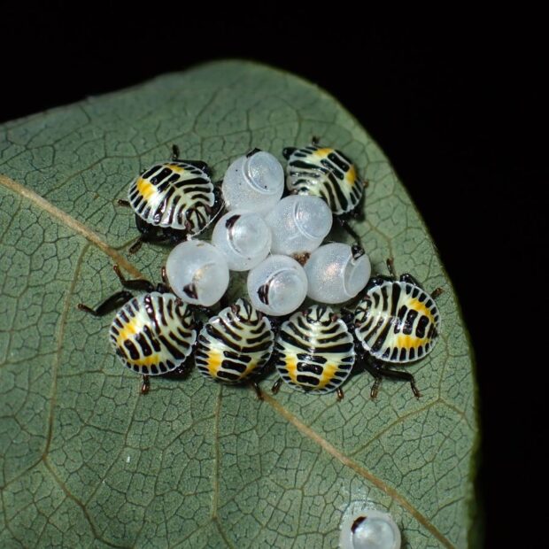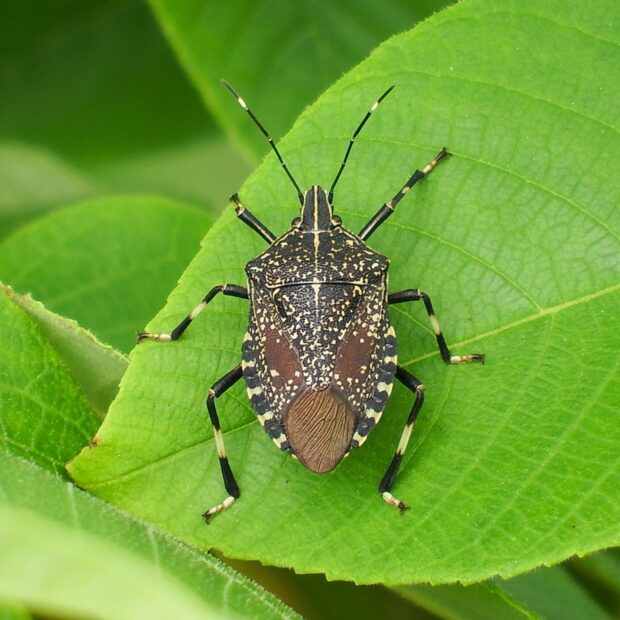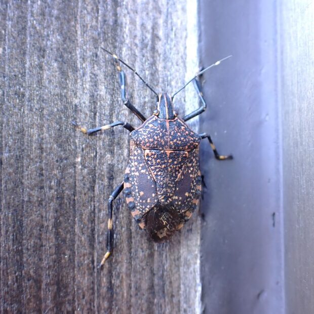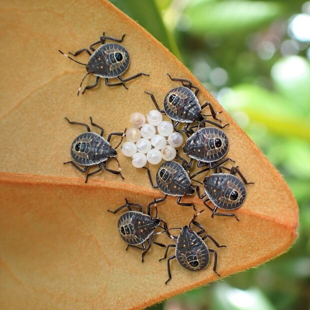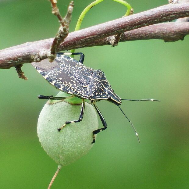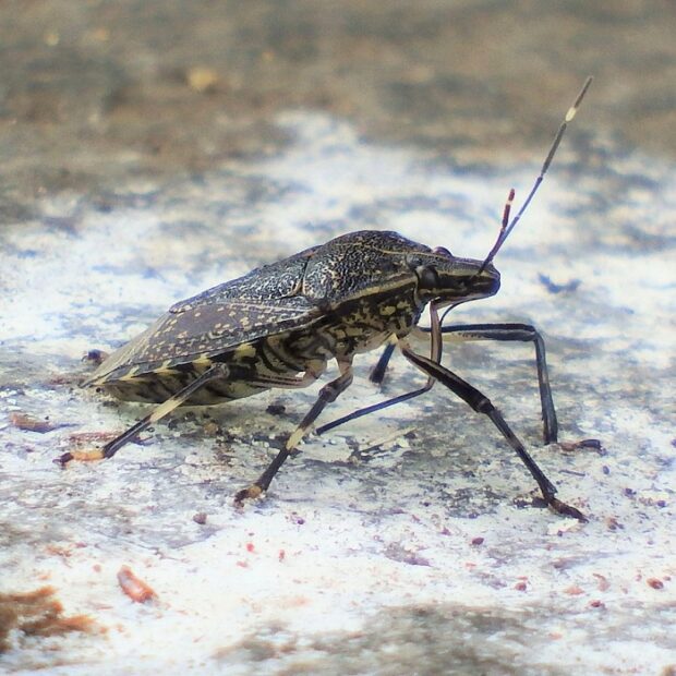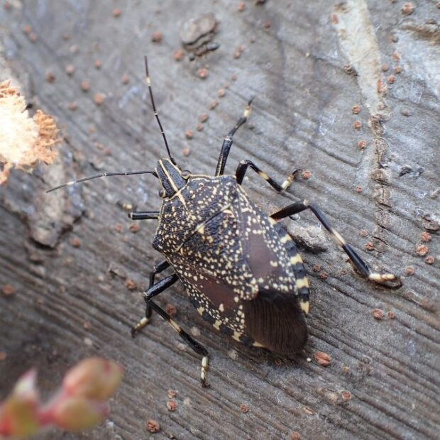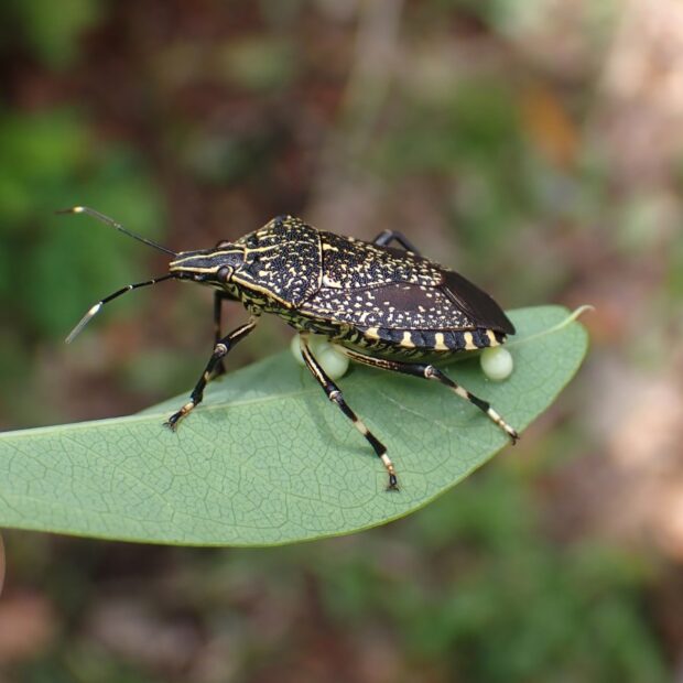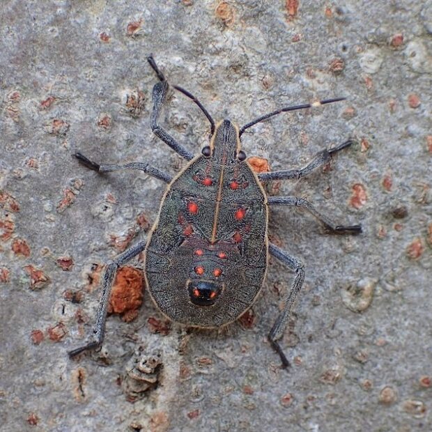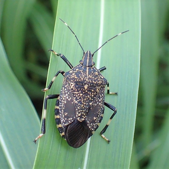 黒色に黄色い点々がたくさんある大きなカメムシで、 頭から胸にかけて黄色のたて線があります。 台湾や東南アジアを原産地とする外来種で、 急速に分布を広げています。 関東地方の平野では、 公園や街路樹などで普通に見られます。