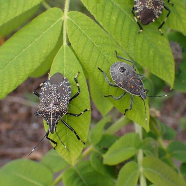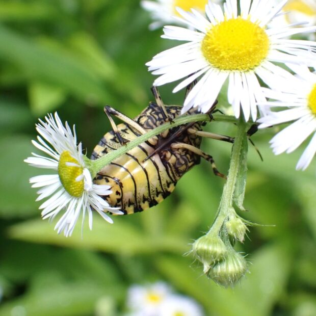 黒色に黄色い点々がたくさんある大きなカメムシで、 頭から胸にかけて黄色のたて線があります。 台湾や東南アジアを原産地とする外来種で、 急速に分布を広げています。 関東地方の平野では、 公園や街路樹などで普通に見られます。