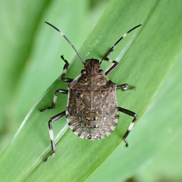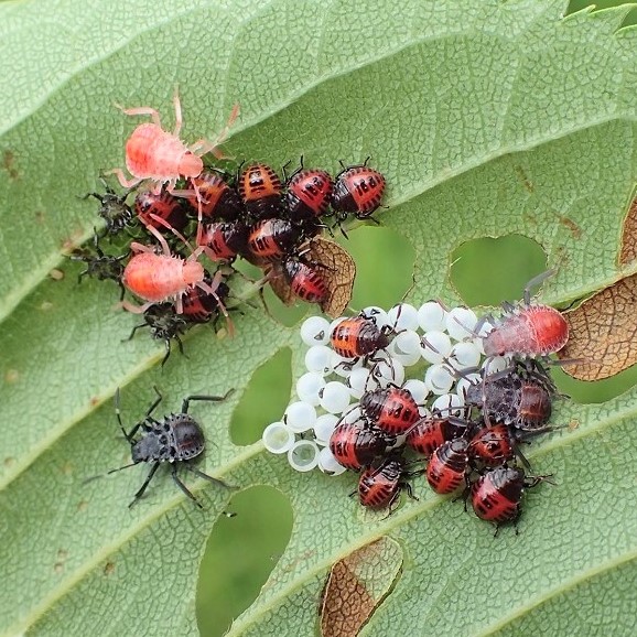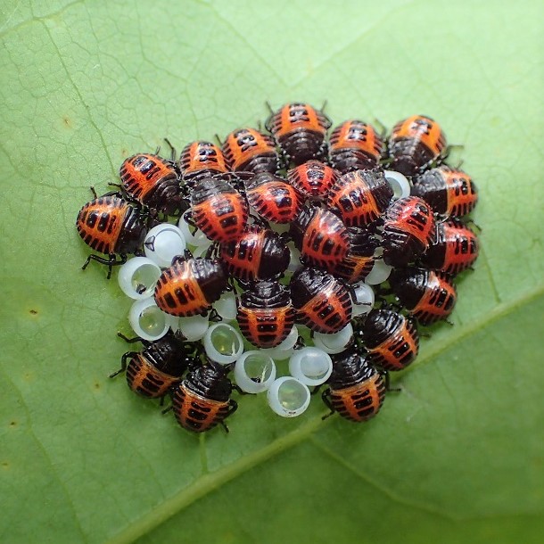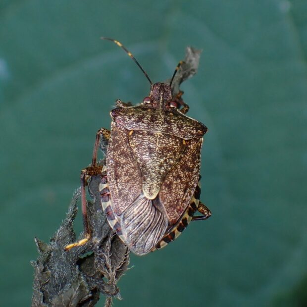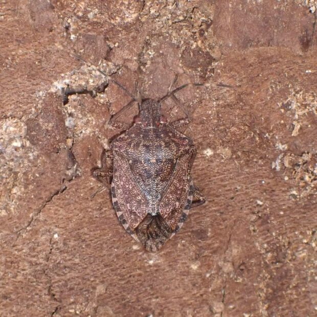 暗褐色の地に点々がたくさんある臭いカメムシで、 普通に見られます。 樹皮の下などで成虫で越冬しますが、 山間部では集団で家に入って来ることがあります。 マメ類、 果実など、 いろいろな植物の汁を吸います。