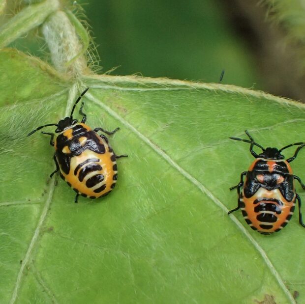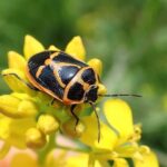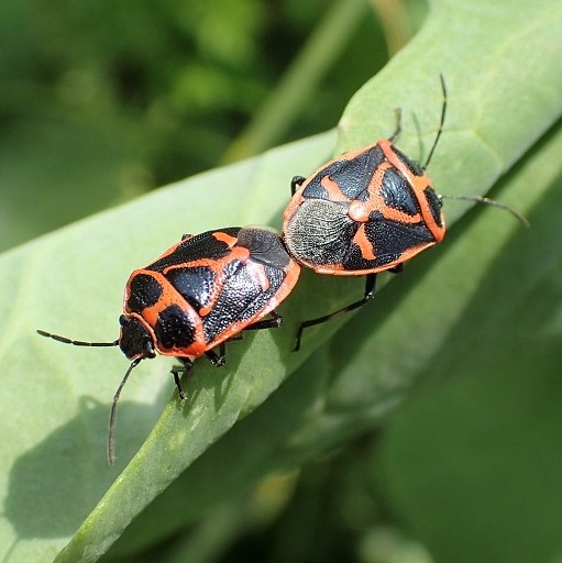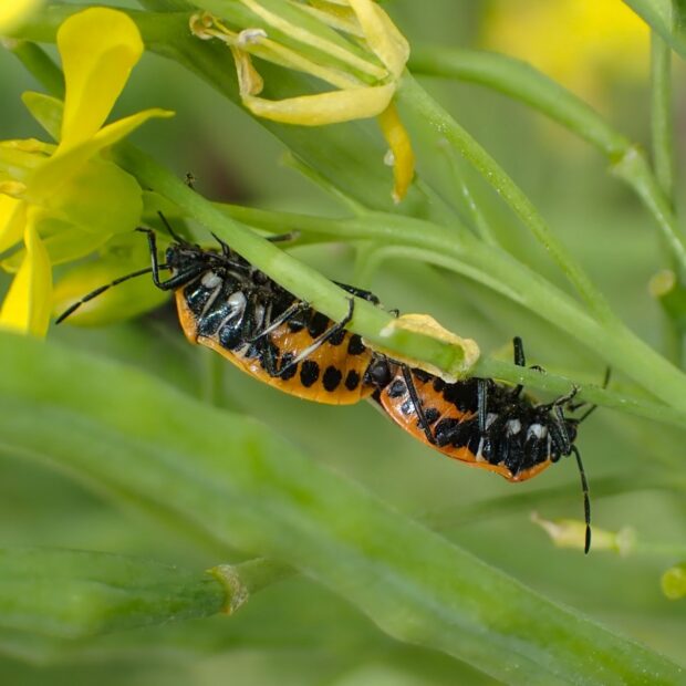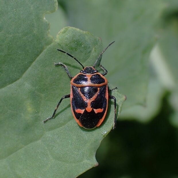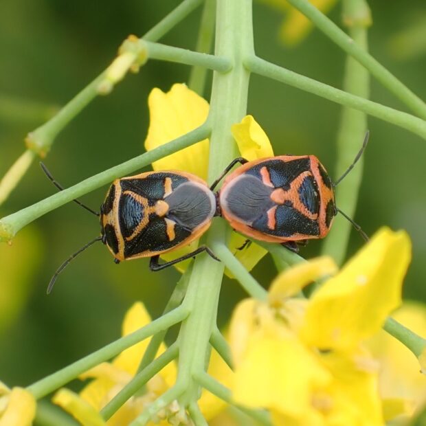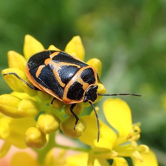 黒っぽい色に、 オレンジや赤の模様がある小さなカメムシ。 菜の花などアブラナ科植物が生えている明るい草地で見られ、 集団でいることがあります。 畑のダイコンなどにもつきます。
