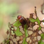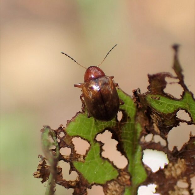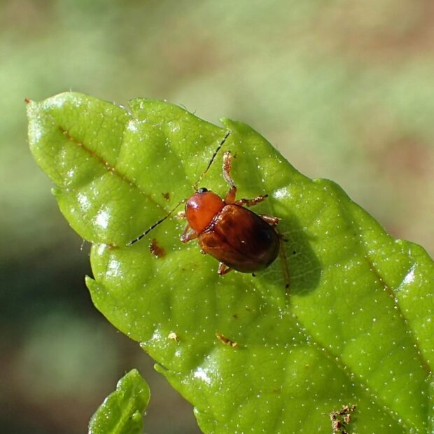 ハンノキの葉を食べる小さなサルハムシの仲間。 山で多く見られ、 ハンノキサルハムシとも呼ばれます。 光沢があり茶褐色をしていますが、 変異があり黒くなるのもいます。
