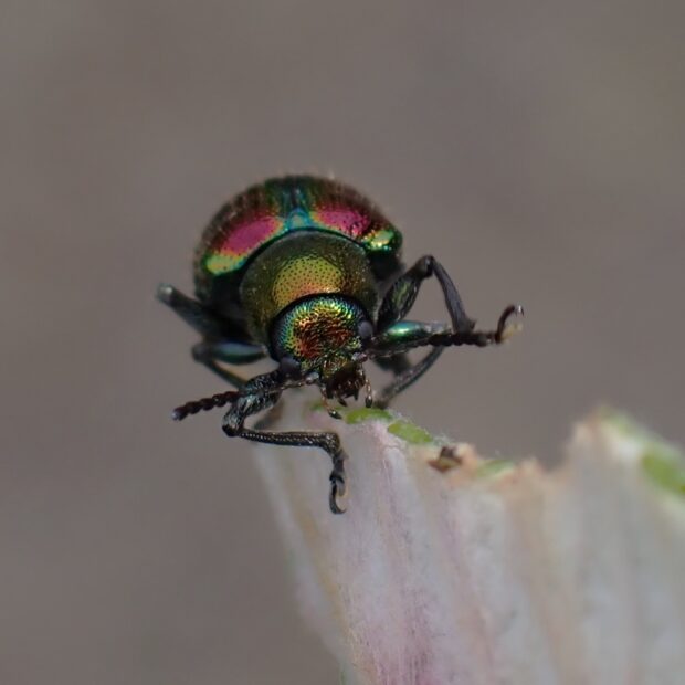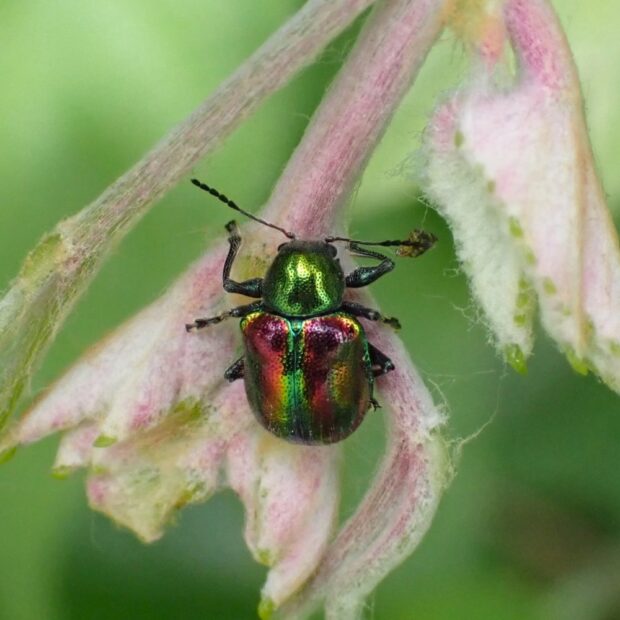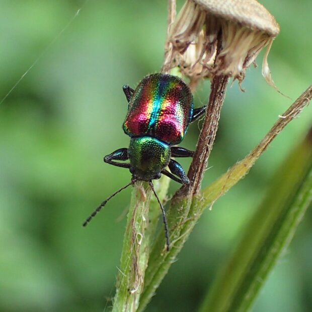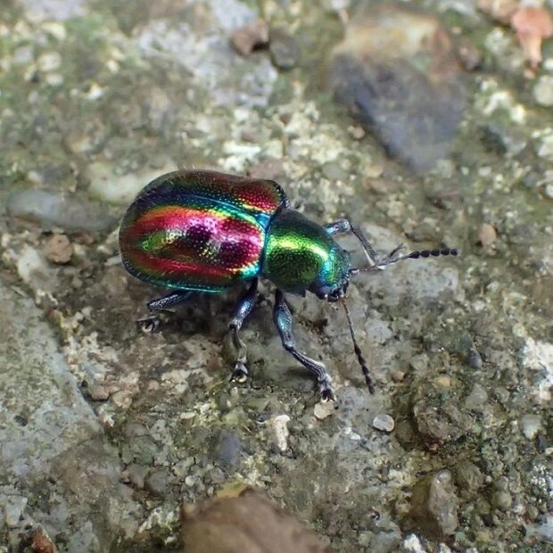 ピカピカに輝く金属光沢のある美しいハムシ。 胸は緑色、 上翅(じょうし)は赤色と緑色。 林縁のノブドウ、 エビヅルなどブドウ類の葉で見られます。 産卵は食草の根もとに行い、 幼虫は地中で根を食べます。