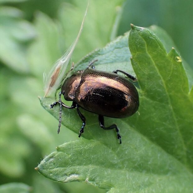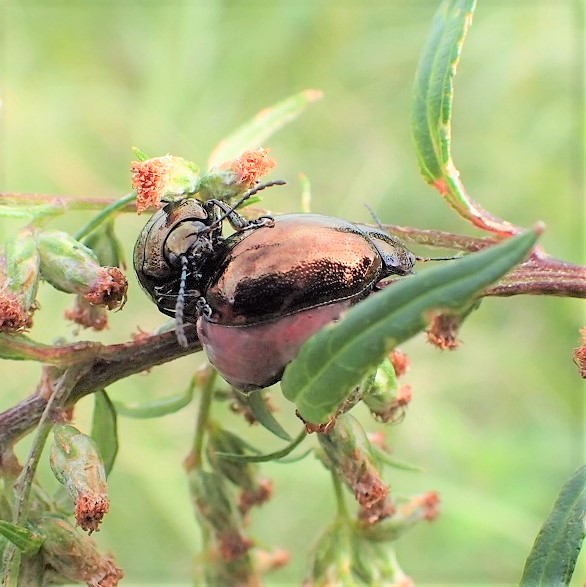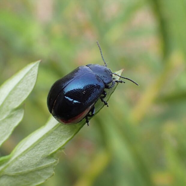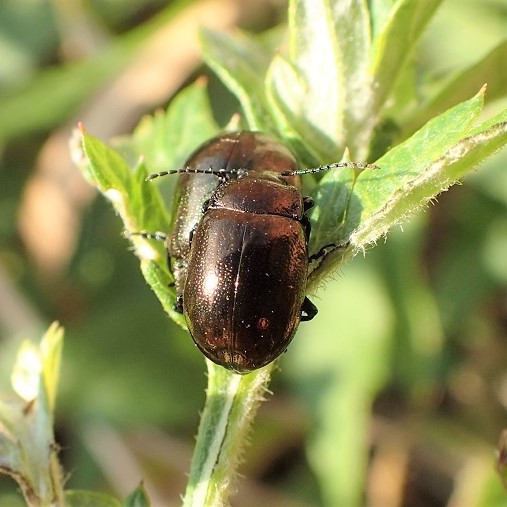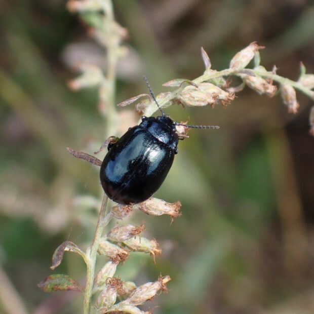 草地、 川原などのヨモギで見られる身近なハムシ。 光沢があり、 体色は青藍色と銅色の2つのタイプがいます。 よく歩き回り、 あまり飛びません。 成虫または卵で越冬します。