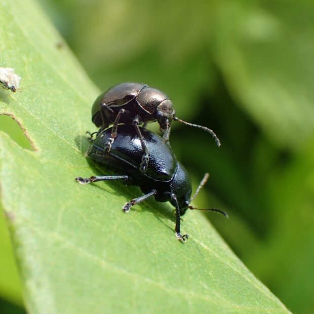 ヨモギを食べるずんぐりしたハムシ