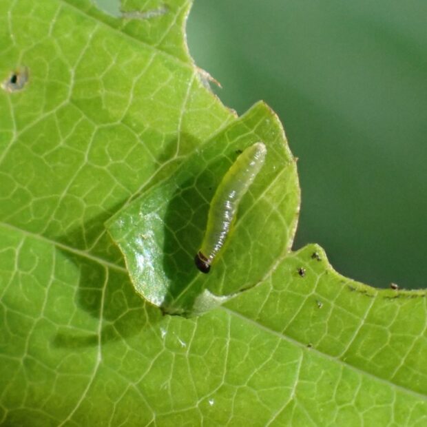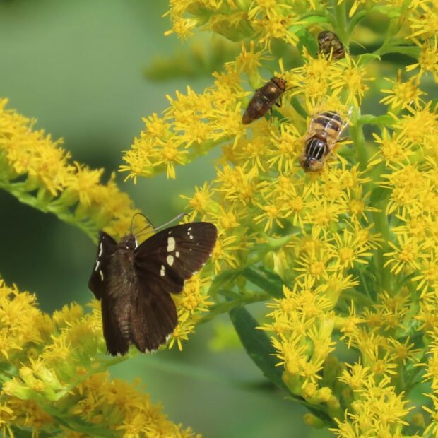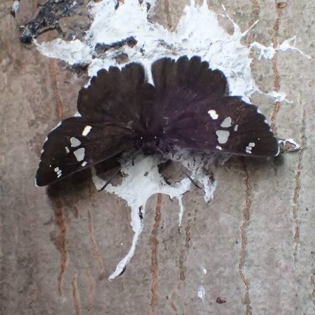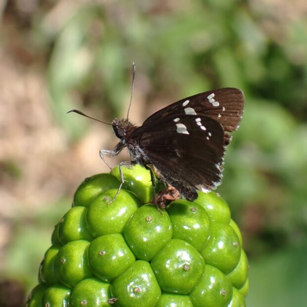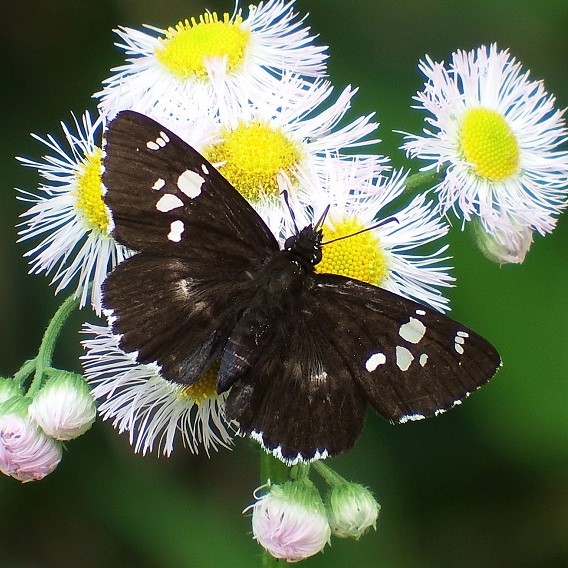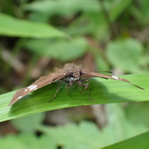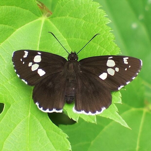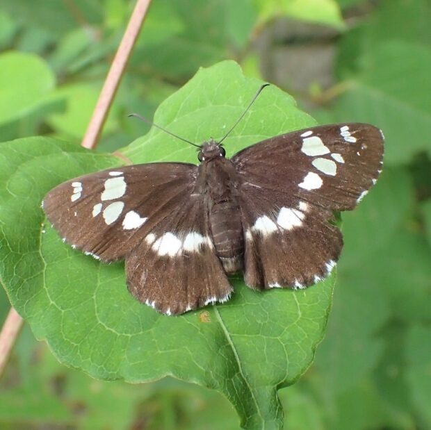 黒褐色に白い帯があるセセリチョウ。 林縁や林の中をすばやく飛びまわり、 はねを水平に開いてよくとまります。 後ばねの白い帯は地域により違いが見られ、 近畿地方より西では白い帯があるものが多く、 中部地方より東では白い帯がないものが多いです。