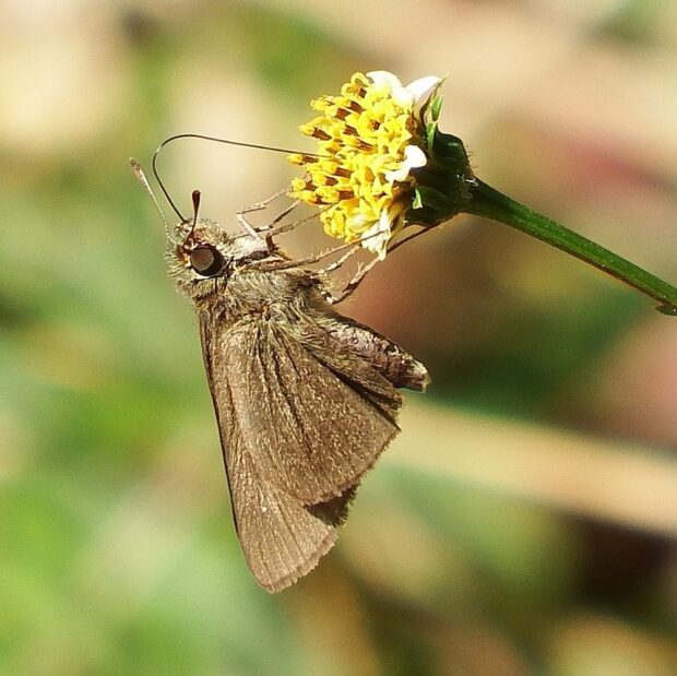 眼がパッチリ、 小さな茶色のセセリチョウ
