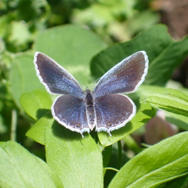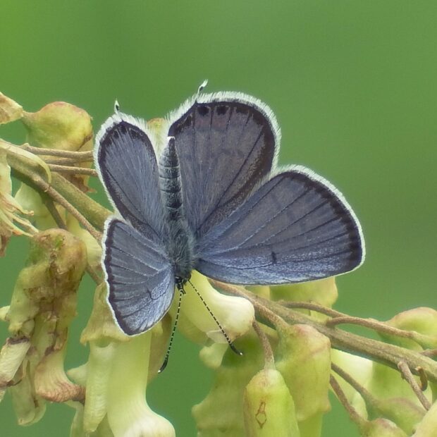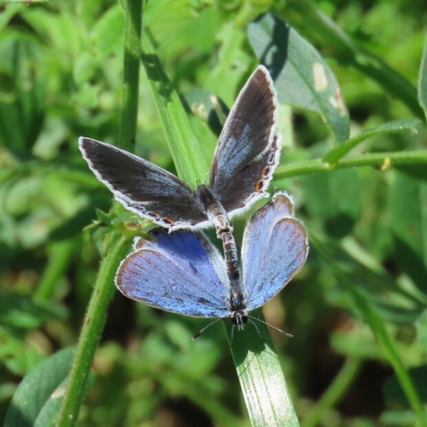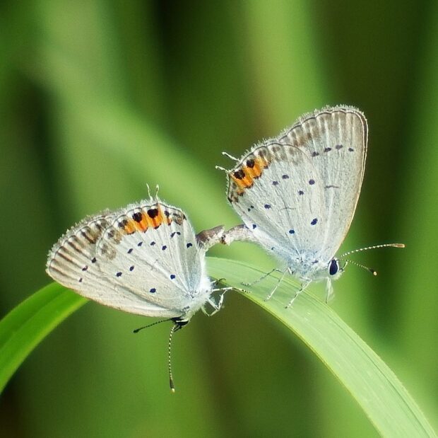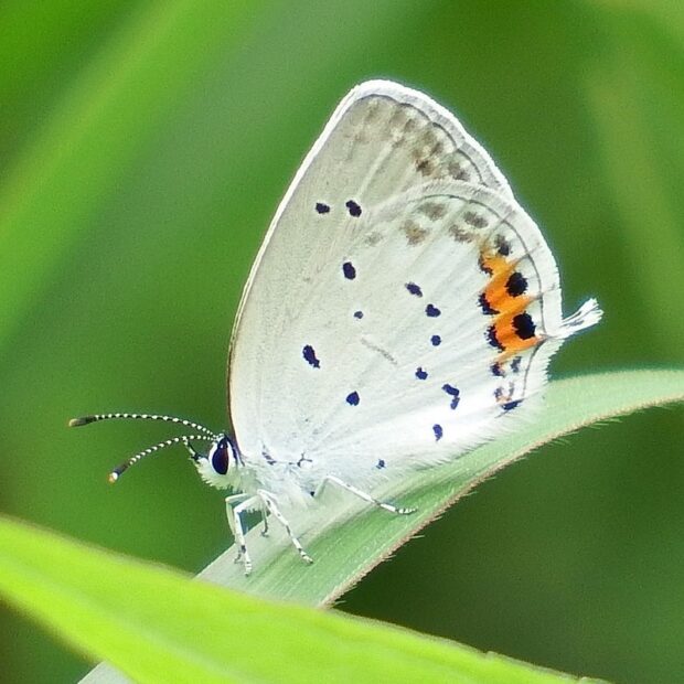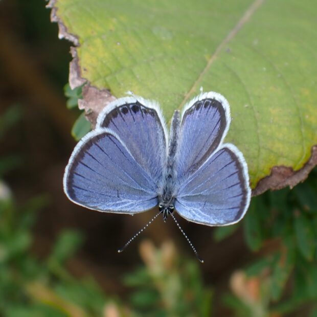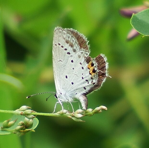 裏ばねは白っぽくオレンジ色の紋がある小さなシジミチョウ。 後ばねにしっぽのような尾状突起があることから、 「ツバメ」と名づけられました。 オスの表ばねは青色、 メスは黒っぽいです。 明るい草地、 公園などで普通に見られます。
