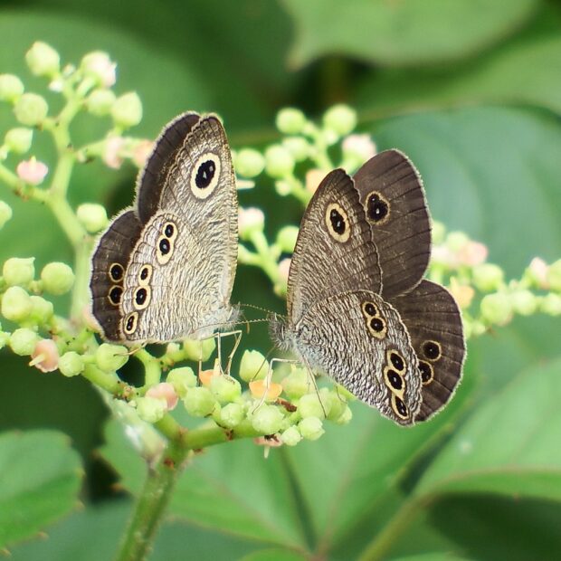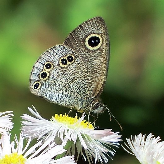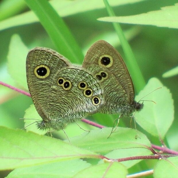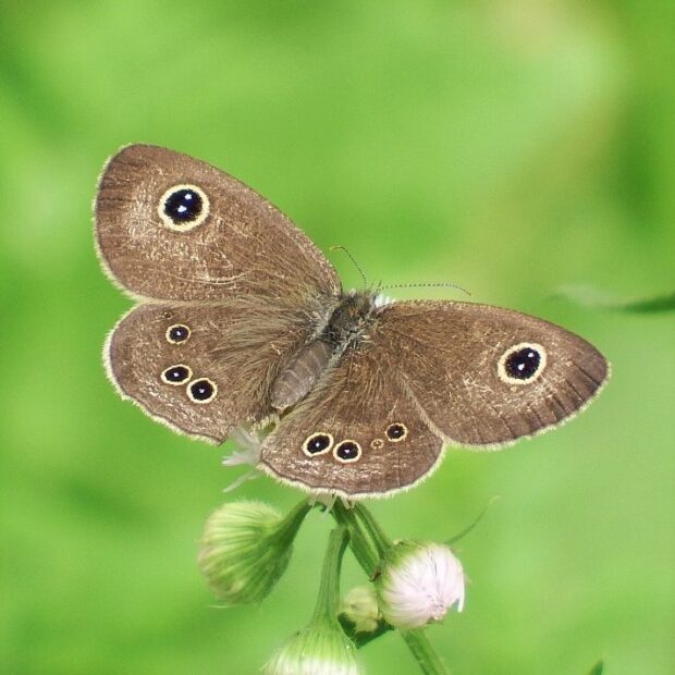 裏ばねが波模様で、 目玉模様(眼状紋)があるタテハチョウの仲間。 明るい草地でフワフワ飛んでいる姿を普通に見ることができますが、 都市部では減少しています。 よく花を訪れます。 (MT)