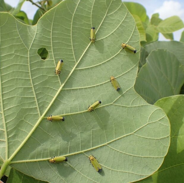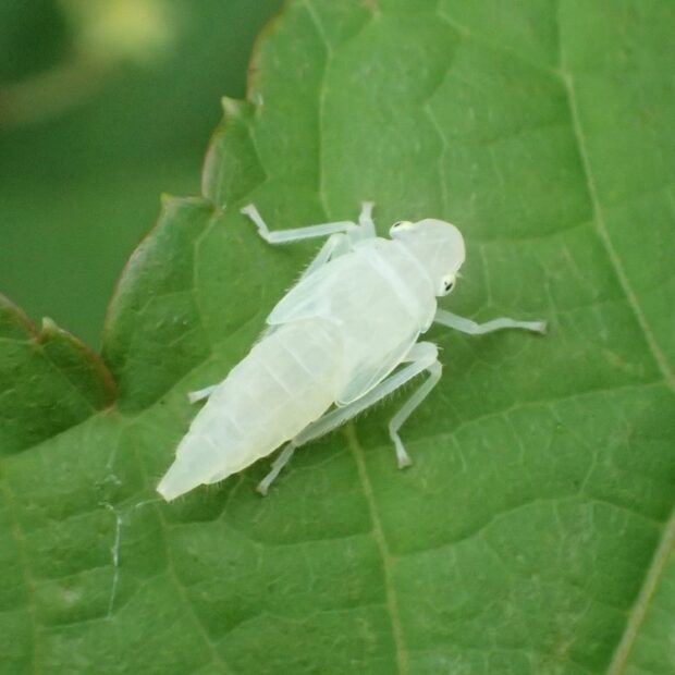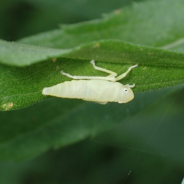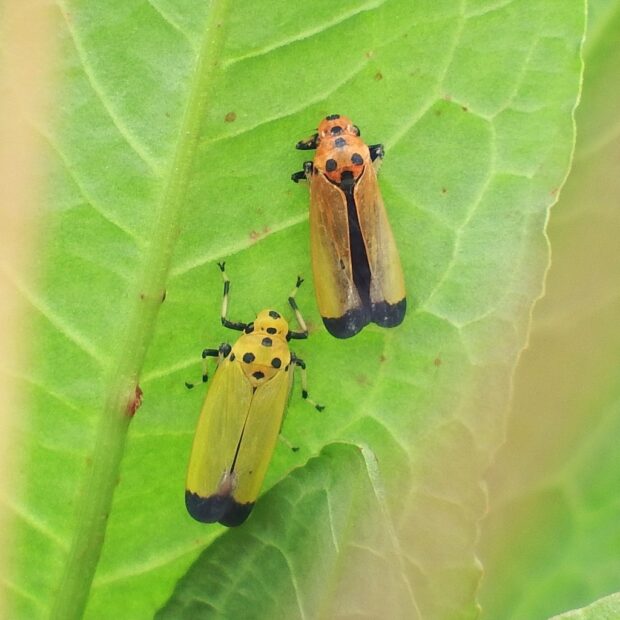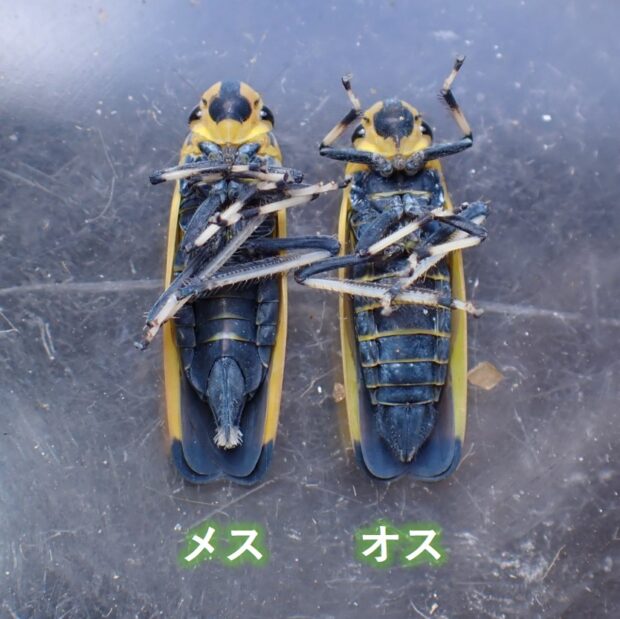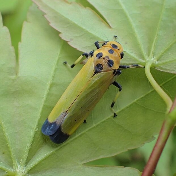 黄~黄緑色で、 はねの端が黒く、 頭と胸に黒点がある大きなヨコバイ。 体の色がバナナに似ているため「バナナムシ」と呼ばれます。 様々な植物の葉の裏にとまり、 汁を吸います。 都市部の公園や草地で普通に見られます。