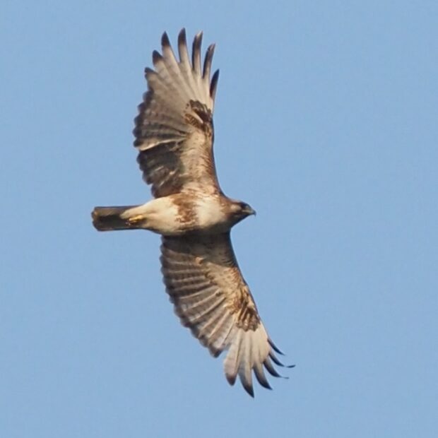 ゆったりと旋回しながら飛んでいることが多く、 カラスやトビと違い白い羽が目立ちます。 飛んでいるときは腹部の茶色い帯と、 翼の茶色い点が目立ちます。 主にネズミを捕食しますが、 トカゲやカエルなども食べることがあります。