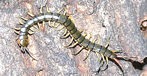昆虫類やミミズを食べます。 大きなアゴは脚が進化したものです。 農業面からいろいろな害虫を捕食する益虫です。 林内の倒木や石の下などに生息しています。 脚は21対あります。