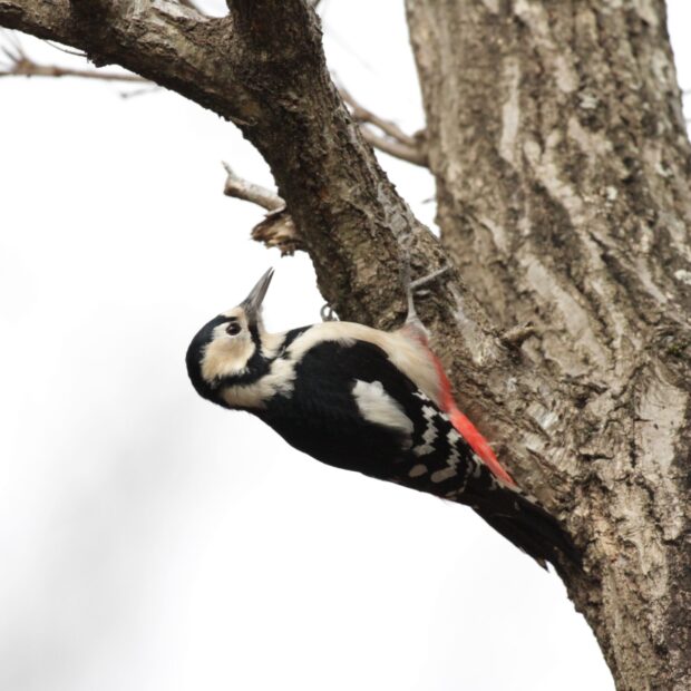 林の木の幹を歩き採食するだけで無く、 地上に降りて昆虫などを食べることがあります。 また、 木の実を食べることもあります。 繁殖期になると木の幹をたたき「ドロロロロロ・・・・」と音を出します。 これをドラミングといいます。 アカゲラの雄は後頭部が赤いのが特徴です。