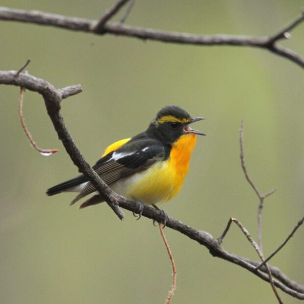 平地や山地の明るい林で生活し、 昆虫を主に採食します。 枝に止まって飛んでいる昆虫を探し空中で捕獲することもあります。 繁殖期になるとオスはきれいな声でさえずります。 さえずりは地域によって異なります。