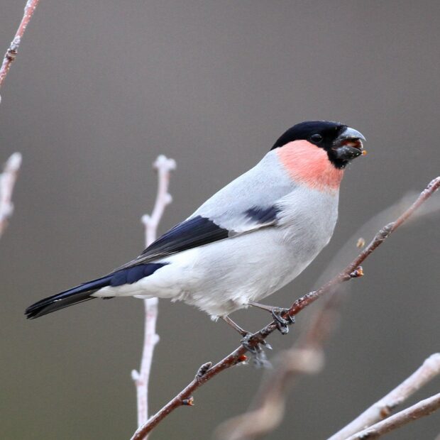小群で行動し、 草や木の種子や芽を食べます。 特にソメイヨシノの冬芽を好む傾向があります。 オスの頬は赤色で、 メスは赤色の部分がありません。 移動中に「ヒュイ、 ヒュイ」と、 口笛のような声で鳴きます。